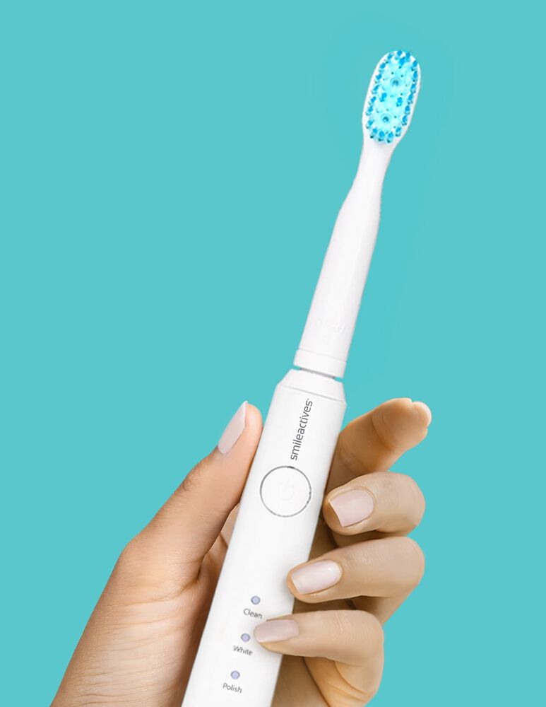 - Apply a small amount of toothpaste to brush head before turning the brush on. For additional whitening power, add an equal amount of Smileactives® Pro Whitening Gel next to the toothpaste on the brush.